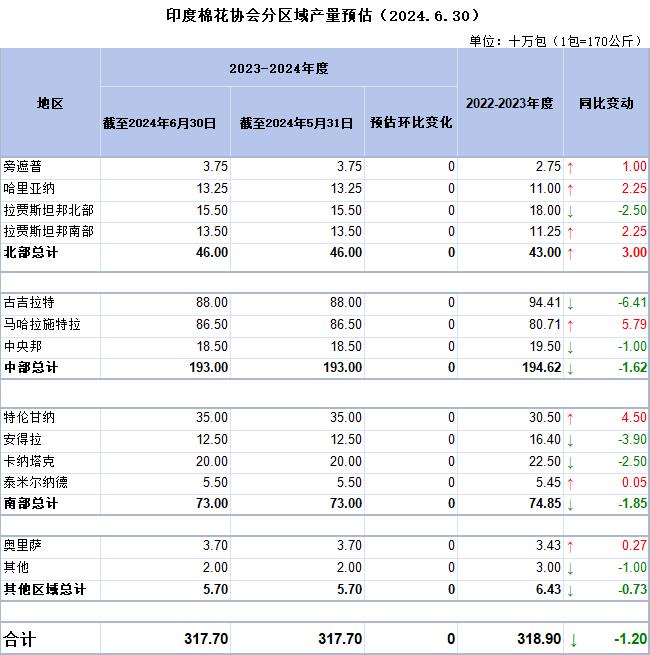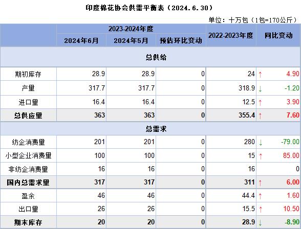 截至2024年6月底的棉花總供應(yīng)量估計(jì)為3630萬包,進(jìn)口164萬包,期初庫存289萬包。