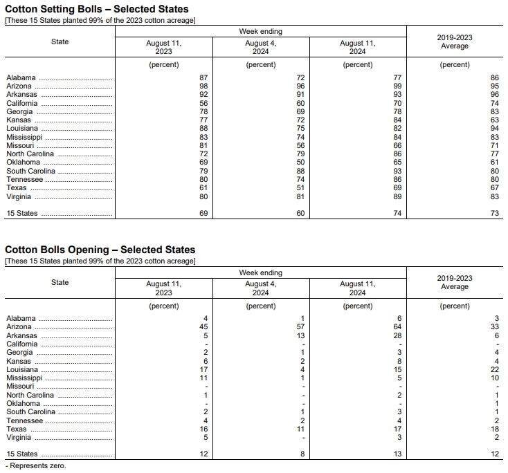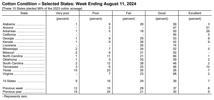 美國農(nóng)業(yè)部(USDA)在每周作物生長報告中公布稱,截至2024年8月11日當(dāng)周,美棉現(xiàn)蕾率為96%,前周為91%,上年同期為95%,五年均值為95%。美棉結(jié)鈴率為74%,前周為60%,上年同期為69%,五年均值為73%。美棉盛鈴率為13%,前周為8%,上年同期為12%,五年均值為12%。美棉優(yōu)良率為46%,前周為45%,上年同期為36%。