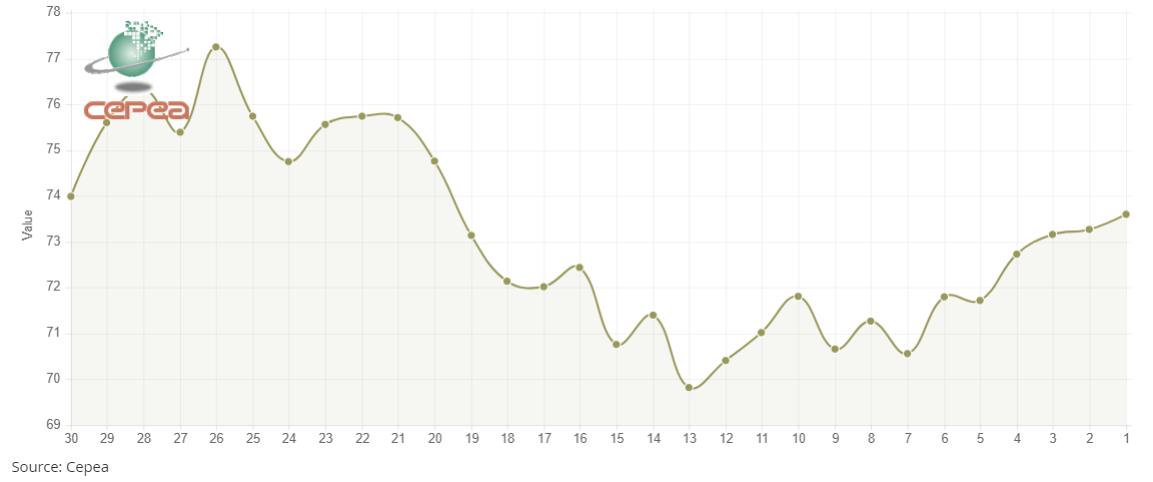 據(jù)外電8月13日消息,8月13日巴西CEPEA/ESALQ棉花價(jià)格指數(shù)報(bào)每磅73.60美分,較前一日上漲0.45%。