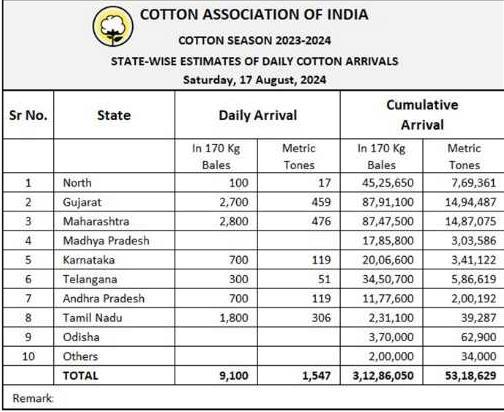 據(jù)外電8月17日消息,印度棉花協(xié)會(huì)(CAI)公布,8月17日印度棉花到貨量預(yù)估為9100包(每包170公斤)或1564噸。