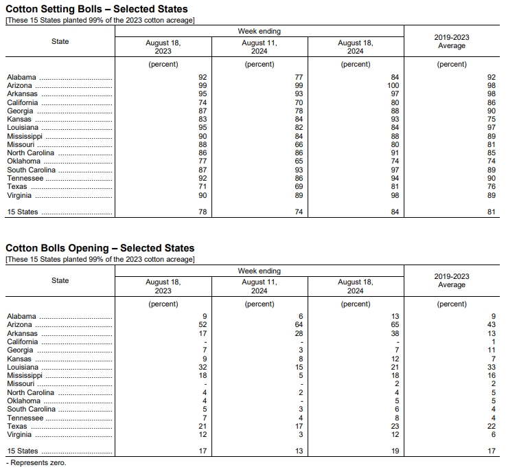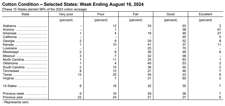 美國農業(yè)部(USDA)在每周作物生長報告中公布稱,截至2024年8月18日當周,美棉結鈴率為84%,前周為74%,上年同期為78%,五年均值為81%。美棉盛鈴率為19%,前周為13%,上年同期為17%,五年均值為17%。美棉優(yōu)良率為42%,前周為46%,上年同期為33%。