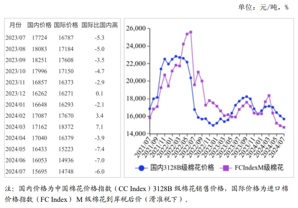 (二)國際棉價連續(xù)4個月下跌。春播以來北半球各主產區(qū)棉花播種順利、長勢較好,美國農業(yè)部(USDA)7月預測2024/25年度全球棉花增產幅度大于消費增加幅度,棉花供需繼續(xù)維持寬松格局,國際棉價持續(xù)承壓。7月,CotlookA指數(shù)(相當于國內3128B級棉花)月均價每磅81.63美分,環(huán)比跌1.6%,同比跌12.3%。