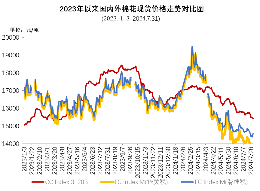 7月上半月,南半球新棉上市,美棉植棉面積增加,疊加USDA發(fā)布新年度產(chǎn)量調(diào)增幅度大于消費(fèi)量等因素影響,ICE期棉主力合約下跌,跌至70美分/磅附近;下半月市場(chǎng)對(duì)美國(guó)經(jīng)濟(jì)衰退擔(dān)憂逐漸增加,外圍能源、谷物市場(chǎng)普遍下跌,ICE期棉繼續(xù)走低,最低跌至67.5美分/磅。7月ICE期棉主力合約月均結(jié)算價(jià)70.71美分/磅,環(huán)比下跌2.3美分,跌幅3.1%。中國(guó)進(jìn)口棉價(jià)格指數(shù)FCIndexM月均為80.5美分/磅,環(huán)比下跌1.6美分;月底79.4美分/磅,環(huán)比下跌4.3美分,1%關(guān)稅下折人民幣13908元/噸,低于同期中國(guó)棉花價(jià)格指數(shù)(CCIndex3128B)1512元,內(nèi)外棉價(jià)差有所擴(kuò)大。