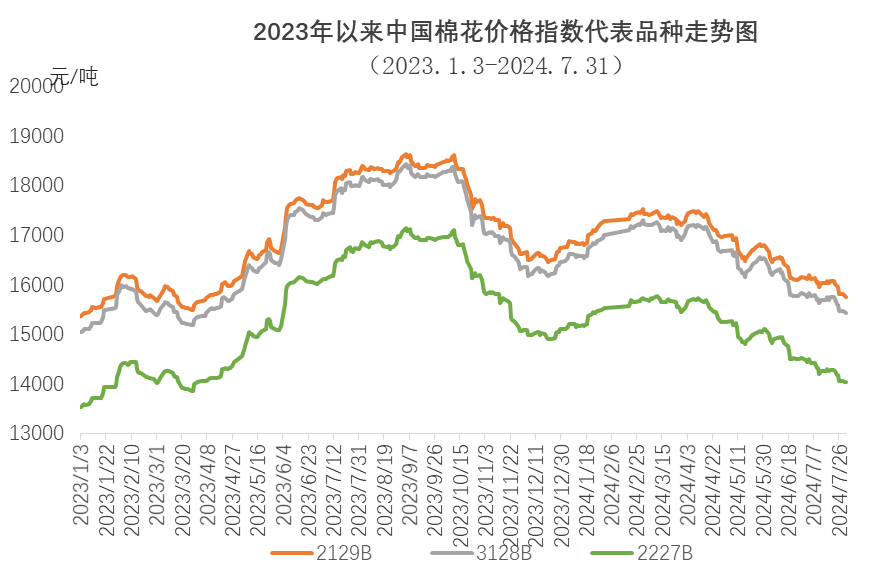 7月,中國(guó)棉花價(jià)格指數(shù)(CCIndex3128B)延續(xù)上月跌勢(shì),7月31日最低跌至15420元/噸,為本年度以來新低。月內(nèi)下游訂單持續(xù)低迷,紡企銷售不暢,皮棉原料采購(gòu)剛需為主。中國(guó)棉花價(jià)格指數(shù)(CCIndex3128B)月均價(jià)15673元/噸,環(huán)比下跌355元,同比下跌2083元。