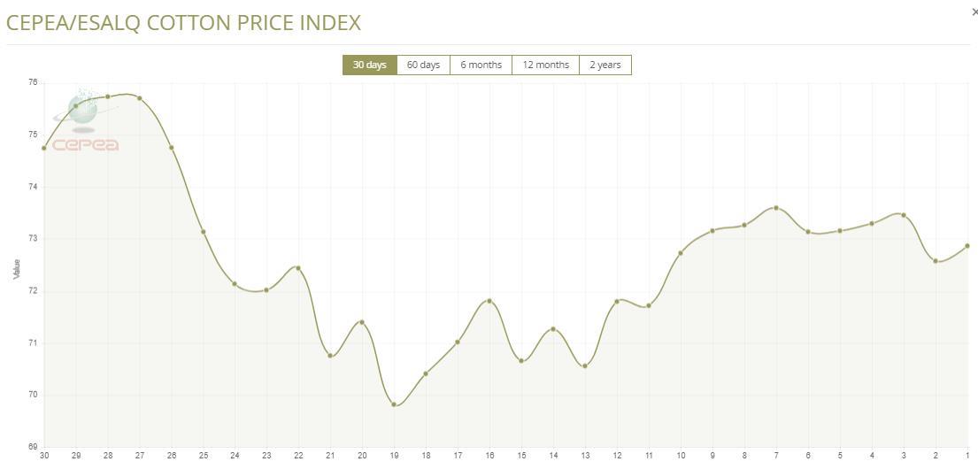 據(jù)外電8月21日消息,8月21日巴西CEPEA/ESALQ棉花價格指數(shù)報每磅72.87美分,較前一日上漲0.40%。