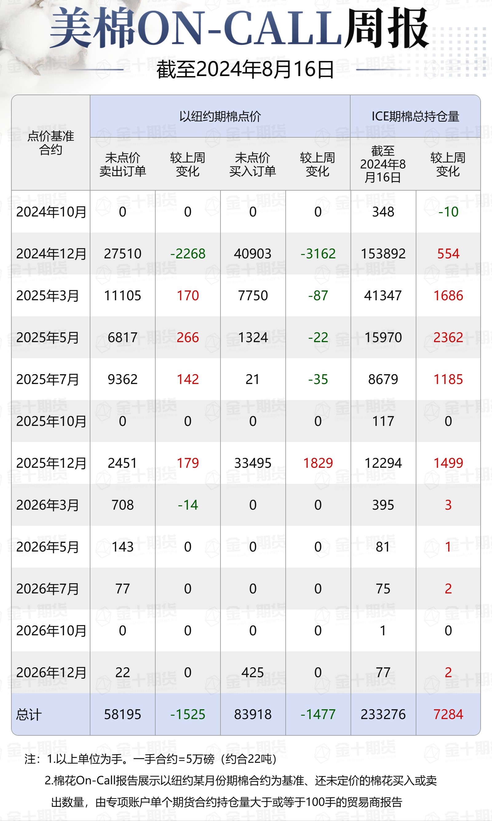 據(jù)美國(guó)商品期貨交易委員會(huì)(CFTC)最新數(shù)據(jù),截至8月16日,①美棉On-Call未點(diǎn)價(jià)賣(mài)出訂單58195手,環(huán)比減少1525手;未點(diǎn)價(jià)買(mǎi)入訂單83918手,環(huán)比減少1477手;②ICE期棉2410合約上賣(mài)方未點(diǎn)價(jià)合約為0手,環(huán)比增加0手;③ICE期棉2412合約上賣(mài)方未點(diǎn)價(jià)合約為27510手,環(huán)比減少2268手;④ICE期棉2503合約上賣(mài)方未點(diǎn)價(jià)合約為11105手,環(huán)比增加170手;⑤ICE期棉2505合約上賣(mài)方未點(diǎn)價(jià)合約為6817手,環(huán)比增加266手;⑥ICE期棉2507合約上賣(mài)方未點(diǎn)價(jià)合約為9362手,環(huán)比增加142手;⑦ICE棉花期貨盤(pán)面2024/25年度(8月至次年7月)的On-Call合約未點(diǎn)價(jià)賣(mài)出訂單為54794手,環(huán)比減少1690手。