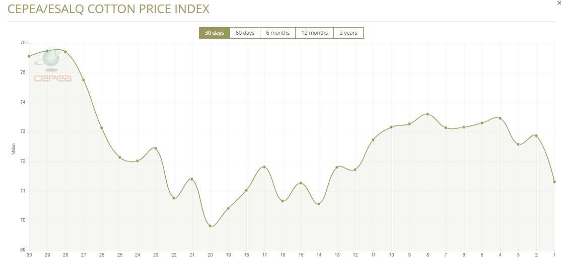 據(jù)外電8月22日消息,8月22日巴西CEPEA/ESALQ棉花價格指數(shù)報每磅71.31美分,較前一日下滑2.14%。