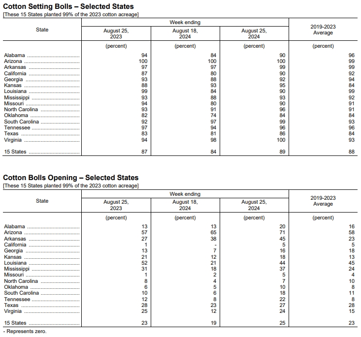 美國(guó)農(nóng)業(yè)部(USDA)在每周作物生長(zhǎng)報(bào)告中公布稱(chēng),截至2024年8月25日當(dāng)周,美棉結(jié)鈴率為89%,前周為84%,上年同期為87%,五年均值為88%。美棉盛鈴率為25%,前周為19%,上年同期為23%,五年均值為23%。美棉優(yōu)良率為40%,前周為42%,上年同期為33%。