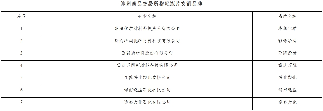 經(jīng)研究決定,指定以下品牌為瓶片交割品牌。