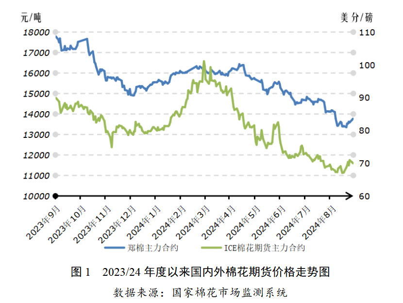 8月以來(lái),美國(guó)制造業(yè)持續(xù)走弱,失業(yè)率上升,疊加日本宣布加息,引發(fā)全球股市及大宗商品市場(chǎng)普遍大跌。同時(shí),新棉增產(chǎn)預(yù)期漸強(qiáng),下游需求偏弱。在外圍市場(chǎng)和棉市基本面雙重利空因素影響下,國(guó)內(nèi)外棉價(jià)不斷下挫,ICE棉花期貨主力合約最低跌至66.26美分/磅,鄭棉主力合約價(jià)格最低跌至13200元/噸。隨后在美國(guó)農(nóng)業(yè)部大幅調(diào)減全球棉花產(chǎn)量預(yù)期,美聯(lián)儲(chǔ)降息預(yù)期升溫帶動(dòng)宏觀(guān)情緒好轉(zhuǎn)的驅(qū)動(dòng)下有所反彈。截至8月27日,ICE棉花期貨主力合約結(jié)算價(jià)69.98美分/磅,較月初上漲1.90美分/磅,漲幅2.8%;代表進(jìn)口棉中國(guó)主港到岸均價(jià)的國(guó)際棉花指數(shù)(M)78.62美分/磅,較月初上漲1.5美分/磅,折人民幣進(jìn)口成本13608元/噸(1%關(guān)稅,不含港雜費(fèi)),較月初上漲259元/噸,漲幅1.9%。鄭州商品交易所棉花期貨主力合約結(jié)算價(jià)13770元/噸,較月初下跌405元/噸,跌幅2.9%;代表內(nèi)地標(biāo)準(zhǔn)級(jí)皮棉市場(chǎng)價(jià)格的國(guó)家棉花價(jià)格B指數(shù)14923元/噸,較月初下跌478元/噸,跌幅3.1%。