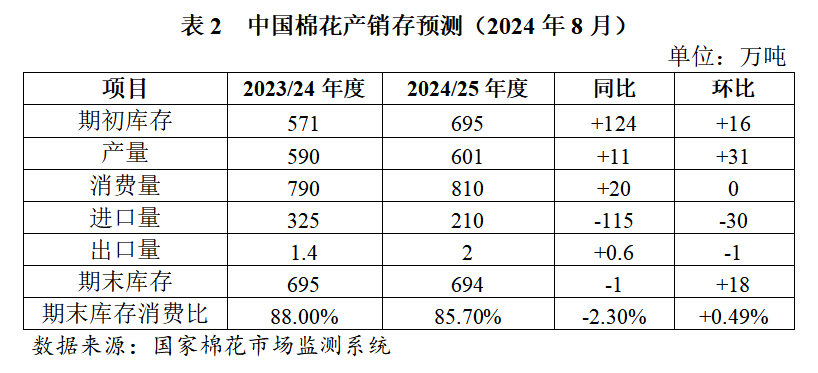 7月中旬以來(lái)新疆部分棉區(qū)積溫較往年明顯偏高,部分地區(qū)出現(xiàn)蕾鈴脫落現(xiàn)象,但目前對(duì)新棉增產(chǎn)預(yù)期影響不大,棉農(nóng)預(yù)計(jì)采摘時(shí)間可能提前7-10天;黃河流域棉區(qū)長(zhǎng)勢(shì)較好,旱情同比減輕,長(zhǎng)江流域棉區(qū)受到高溫和強(qiáng)降水影響,棉花長(zhǎng)勢(shì)不如去年。據(jù)國(guó)家棉花市場(chǎng)監(jiān)測(cè)系統(tǒng)棉花長(zhǎng)勢(shì)調(diào)查,2024/25年度新棉單產(chǎn)預(yù)計(jì)147.2公斤/畝,同比增長(zhǎng)3.2%;棉花產(chǎn)量預(yù)計(jì)601萬(wàn)噸,同比增加11萬(wàn)噸。8月以來(lái),軋花廠(chǎng)陸續(xù)開(kāi)始檢修設(shè)備為新棉收購(gòu)加工做好準(zhǔn)備。但受棉價(jià)持續(xù)下跌影響,赴新疆包廠(chǎng)收購(gòu)的企業(yè)不多,疆內(nèi)大型軋花廠(chǎng)計(jì)劃縮減收購(gòu)規(guī)模,預(yù)計(jì)今年搶收新棉的概率較小,開(kāi)秤價(jià)也將低于去年。