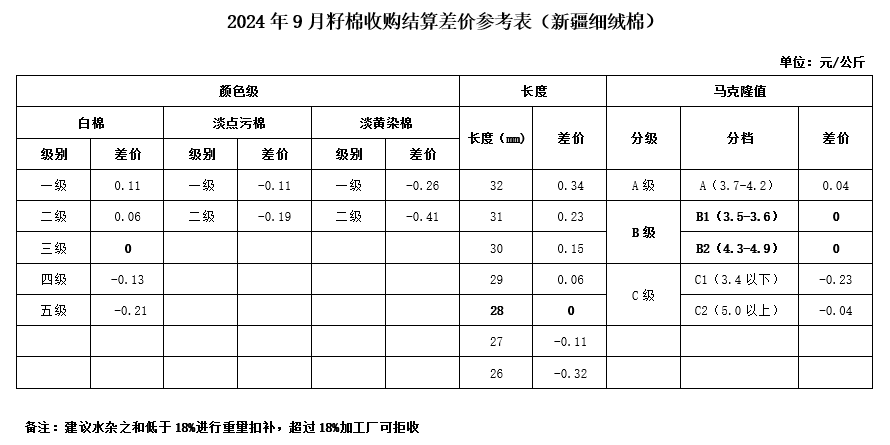 依據(jù)中國(guó)棉花協(xié)會(huì)發(fā)布的2024年9月《鋸齒加工細(xì)絨棉質(zhì)量差價(jià)表》和中國(guó)棉花預(yù)警系統(tǒng)2023年9月-2024年1月新疆籽棉收購(gòu)平均衣分率數(shù)據(jù),折算得出籽棉收購(gòu)差價(jià),現(xiàn)正式發(fā)布2024年9月《籽棉收購(gòu)結(jié)算差價(jià)參考表(新疆細(xì)絨棉)》(單位:元/公斤),為新疆地區(qū)籽棉收購(gòu)工作提供參考。