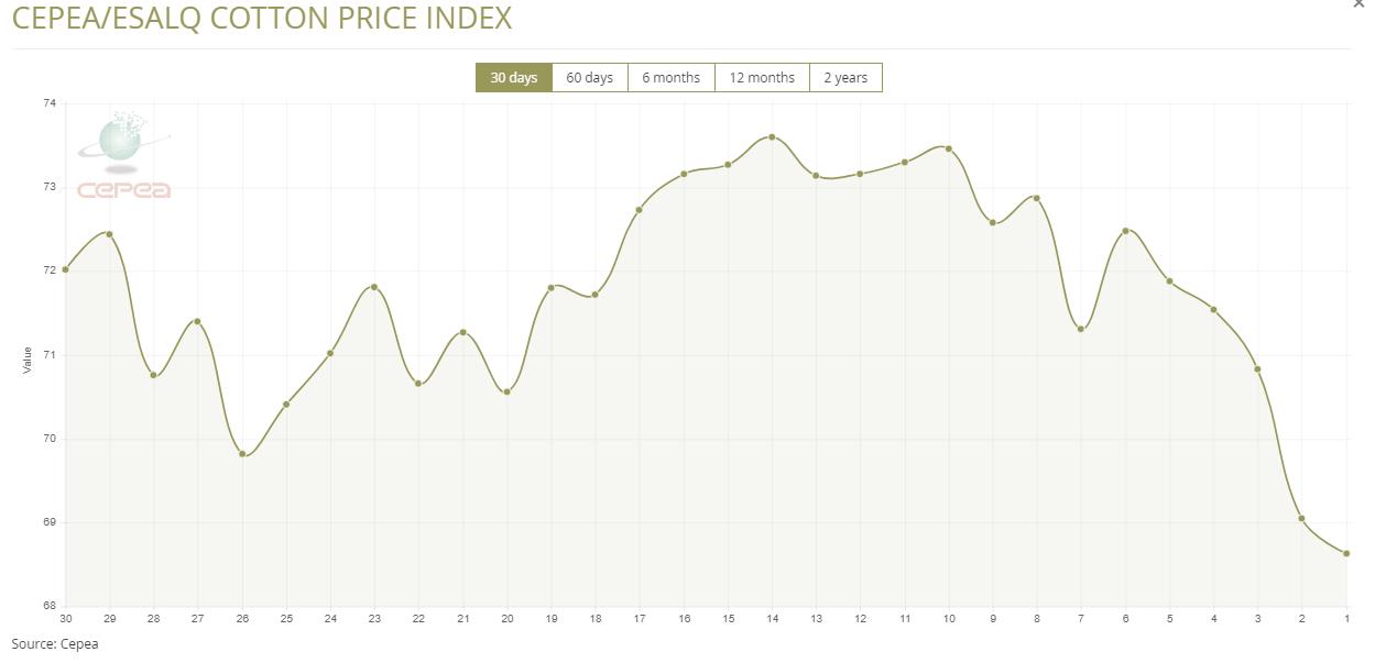據(jù)外電8月30日消息,8月30日巴西CEPEA/ESALQ棉花價格指數(shù)報每磅68.63美分,較前一日下滑0.61%。