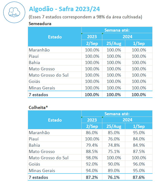 據(jù)巴西農(nóng)業(yè)部下屬的國(guó)家商品供應(yīng)公司CONAB,截至9月1日,巴西棉花收割率為87.6%,上周為76.1%,去年同期為87.2%。