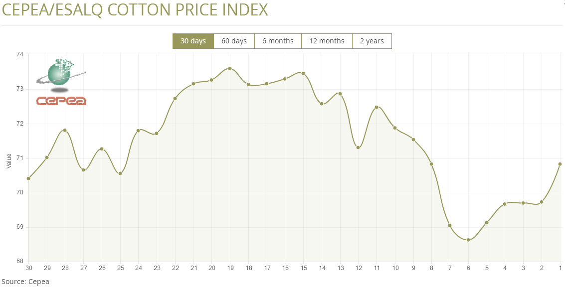 據(jù)外電9月6日消息,9月6日巴西CEPEA/ESALQ棉花價(jià)格指數(shù)報(bào)每磅70.83美分,較前一日上漲1.58%。
