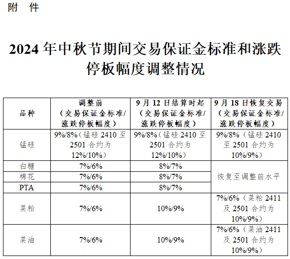 一、自2024年9月12日結(jié)算時(shí)起,菜粕和菜油期貨合約的交易保證金標(biāo)準(zhǔn)為10%,漲跌停板幅度為9%;白糖、棉花和PTA期貨合約的交易保證金標(biāo)準(zhǔn)為8%,漲跌停板幅度為7%。