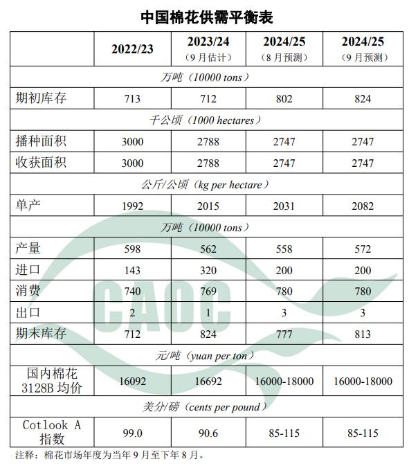 今年全國棉區(qū)綜合氣象條件適宜,病蟲害輕度發(fā)生,棉花長勢總體好于上年,預期單產(chǎn)增加,本月將2024/25年度產(chǎn)量調(diào)增至572萬噸,較上年度增1.8%。當前部分地區(qū)新棉零星上市,開秤價低于去年,預計新疆集中上市時間提前至9月末,隨著棉紡市場傳統(tǒng)旺季臨近,棉花需求有望回升。