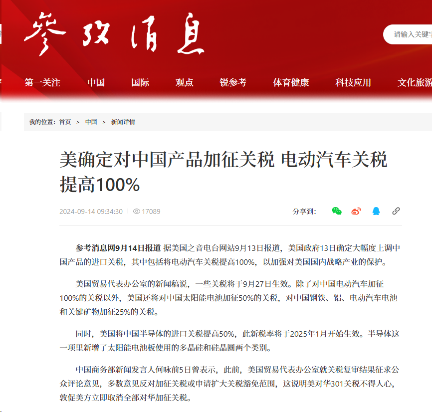 美國(guó)政府13日確定大幅上調(diào)中國(guó)產(chǎn)品進(jìn)口關(guān)稅,其中包括將電動(dòng)汽車(chē)關(guān)稅提高100%,以加強(qiáng)對(duì)美國(guó)國(guó)內(nèi)戰(zhàn)略產(chǎn)業(yè)保護(hù)。美國(guó)貿(mào)易代表辦公室新聞稿說(shuō),一些關(guān)稅將于9月27日生效。除對(duì)中國(guó)電動(dòng)汽車(chē)加征100%關(guān)稅以外,美國(guó)還將對(duì)中國(guó)太陽(yáng)能電池加征50%關(guān)稅,對(duì)中國(guó)鋼鐵、鋁、電動(dòng)汽車(chē)電池、關(guān)鍵礦物加征25%關(guān)稅。同時(shí),美國(guó)將中國(guó)半導(dǎo)體進(jìn)口關(guān)稅提高50%,此新稅率將于2025年1月開(kāi)始生效。半導(dǎo)體這一項(xiàng)里新增太陽(yáng)能電池板使用的多晶硅、硅晶圓2個(gè)類(lèi)別。