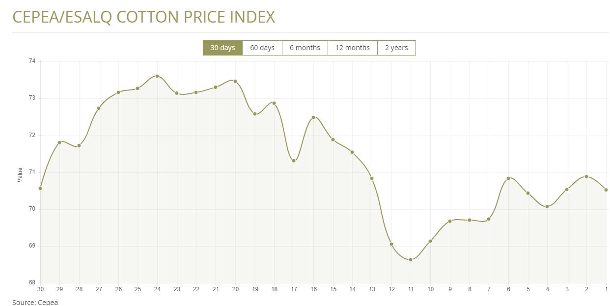 據(jù)外電9月13日消息,9月13日巴西CEPEA/ESALQ棉花價格指數(shù)報(bào)每磅70.52美分,較前一日下跌0.51%。