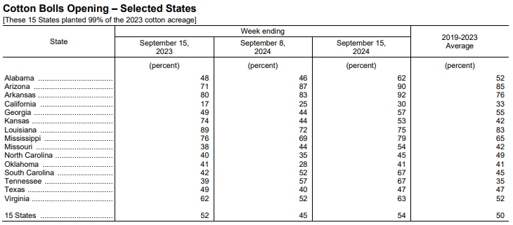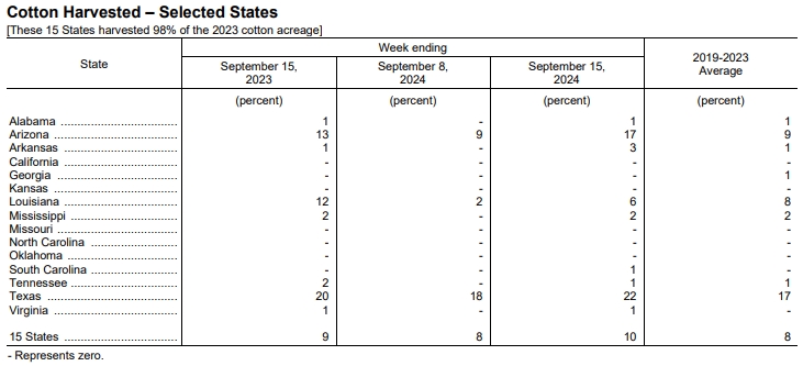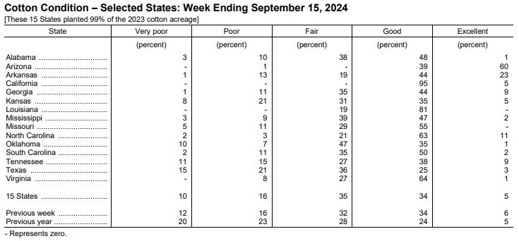 美國農(nóng)業(yè)部(USDA)在每周作物生長報告中公布稱,截至2024年9月15日當(dāng)周,美棉盛鈴率為54%,前周為45%,上年同期為52%,五年均值為50%。美棉收割率為10%,前周為8%,去年同期為9%,五年均值為8%。美棉優(yōu)良率為39%,前周為40%,上年同期為29%。