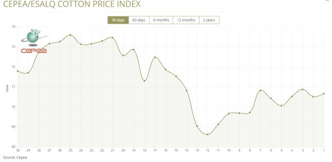 據(jù)外電9月13日消息,9月13日巴西CEPEA/ESALQ棉花價(jià)格指數(shù)報(bào)每磅70.67美分,較前一日上漲0.21%。