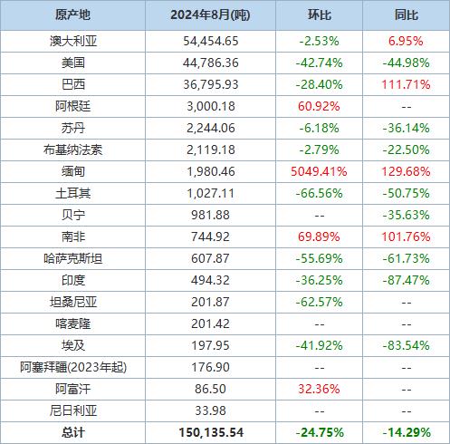 據(jù)海關(guān)統(tǒng)計數(shù)據(jù),2024年8月我國進(jìn)口棉花約15萬噸,環(huán)比減少約5萬噸,同比下降約14.3%。