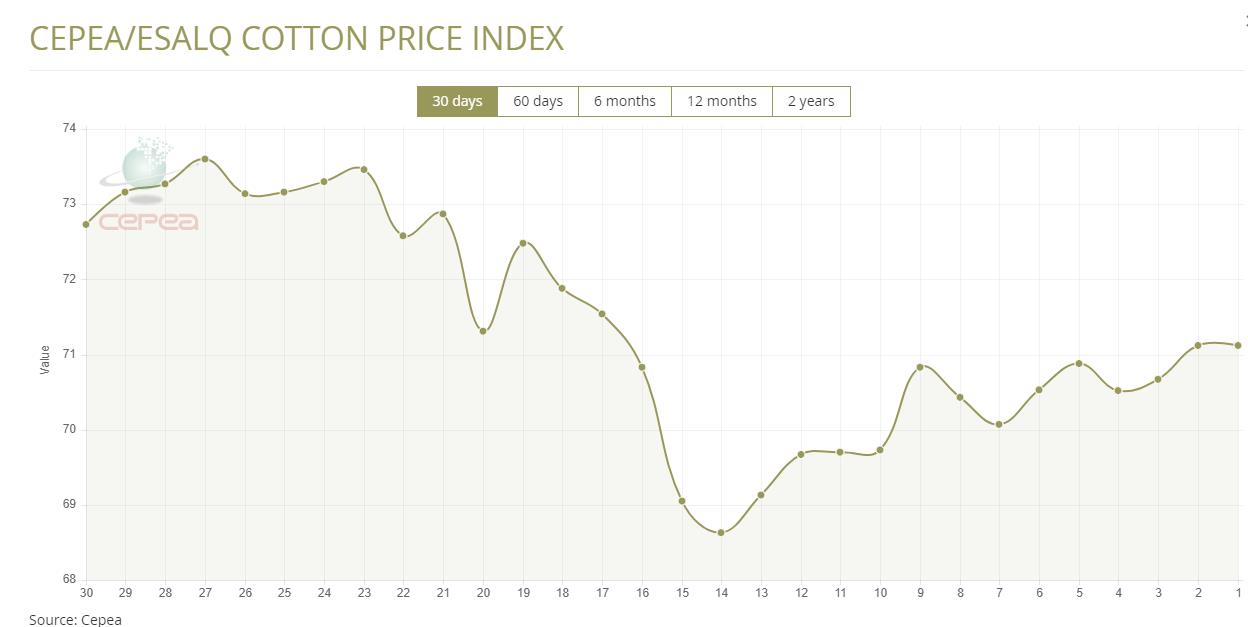 據(jù)外電9月18日消息,9月18日巴西CEPEA/ESALQ棉花價(jià)格指數(shù)報(bào)每磅71.12美分,較前一日持平。