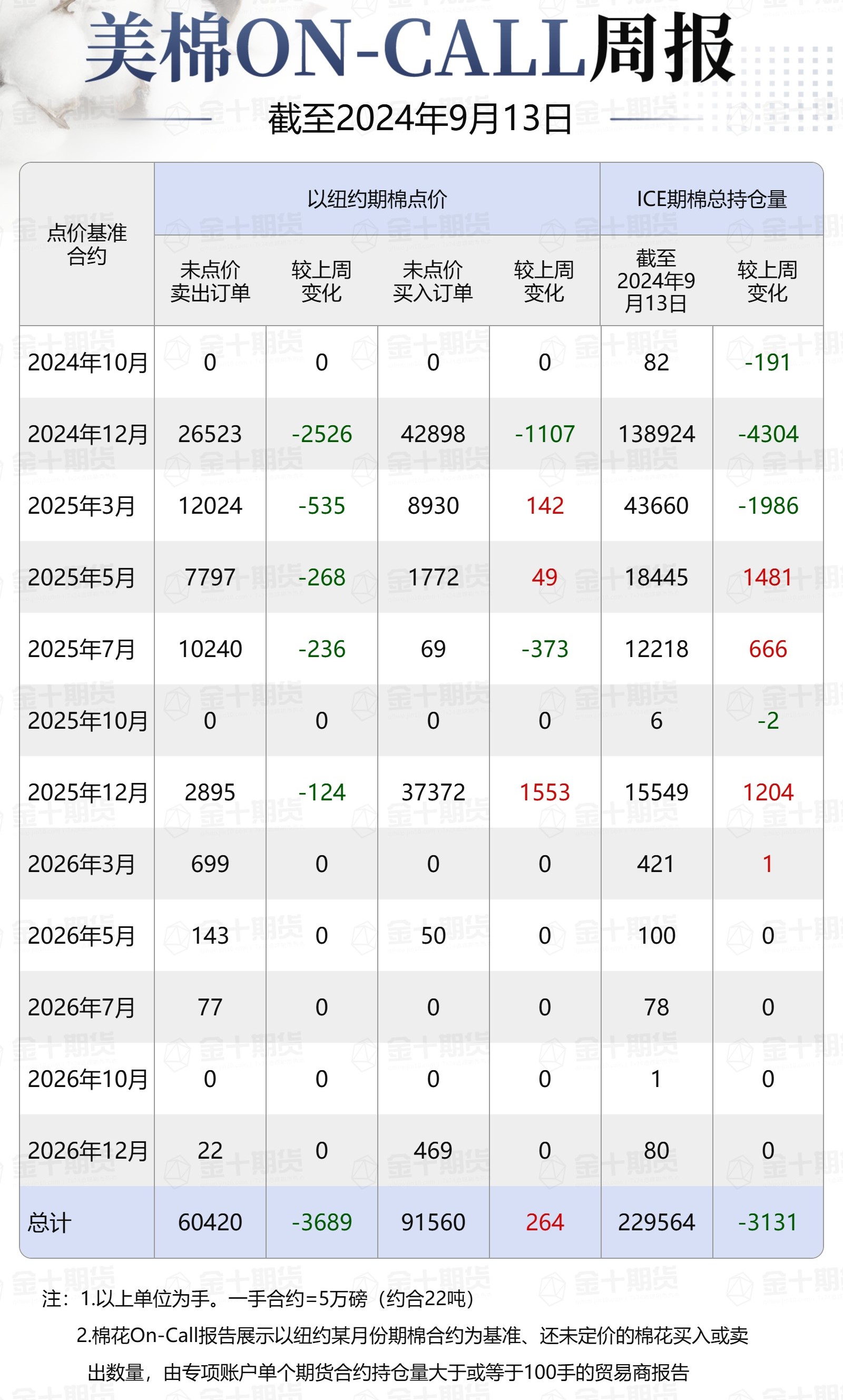 據(jù)美國商品期貨交易委員會(CFTC)最新數(shù)據(jù),截至9月13日,①美棉On-Call未點價賣出訂單60420手,環(huán)比減少3689手;未點價買入訂單91560手,環(huán)比增加264手;②ICE期棉2410合約上賣方未點價合約為0手,環(huán)比增加0手;③ICE期棉2412合約上賣方未點價合約為26523手,環(huán)比減少2526手;④ICE期棉2503合約上賣方未點價合約為12024手,環(huán)比減少535手;⑤ICE期棉2505合約上賣方未點價合約為7797手,環(huán)比減少268手;⑥ICE期棉2507合約上賣方未點價合約為10240手,環(huán)比減少236手;⑦ICE棉花期貨盤面2024/25年度(8月至次年7月)的On-Call合約未點價賣出訂單為56584手,環(huán)比減少3565手。