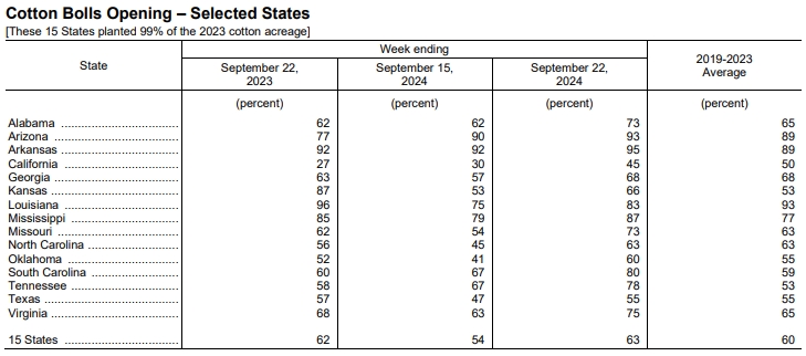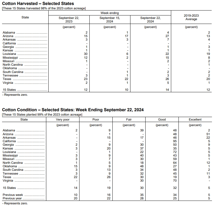 美國農業(yè)部(USDA)在每周作物生長報告中公布稱,截至2024年9月22日當周,美棉盛鈴率為63%,前周為54%,上年同期為62%,五年均值為60%。美棉收割率為14%,前周為10%,去年同期為12%,五年均值為12%。美棉優(yōu)良率為37%,前周為39%,上年同期為30%。