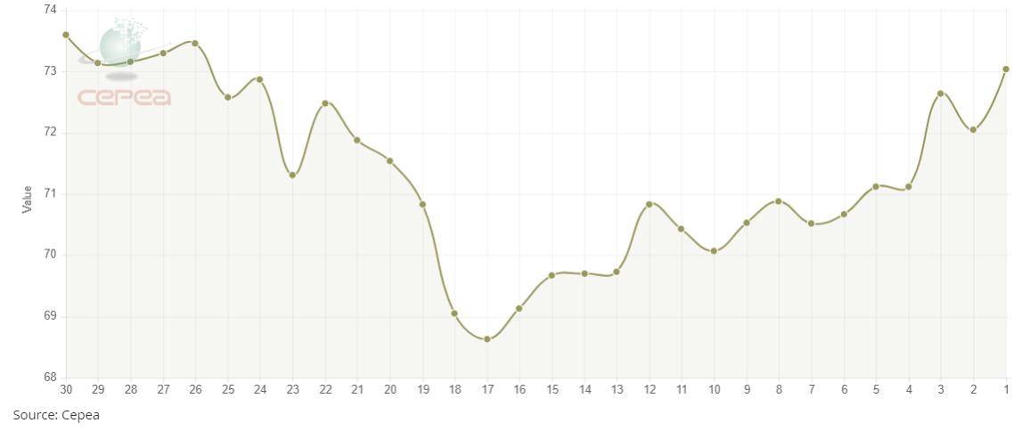 據(jù)外電9月23日消息,9月23日巴西CEPEA/ESALQ棉花價格指數(shù)報每磅73.04美分,較前一日上漲1.37%。