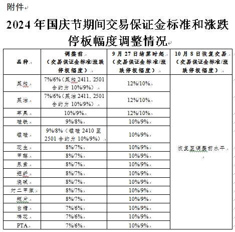 一、自2024年9月27日結算時起,菜粕、菜油和蘋果期貨合約的交易保證金標準為12%,漲跌停板幅度為10%;白糖、棉花、花生、PTA、甲醇、硅鐵、錳硅、尿素、短纖、燒堿、對二甲苯和瓶片期貨合約的交易保證金標準為10%,漲跌停板幅度為9%。