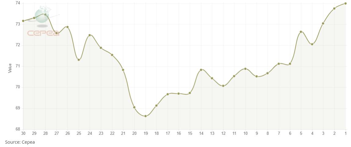 據(jù)外電9月25日消息,9月25日巴西CEPEA/ESALQ棉花價(jià)格指數(shù)報(bào)每磅73.99美分,較前一日上漲0.33%。