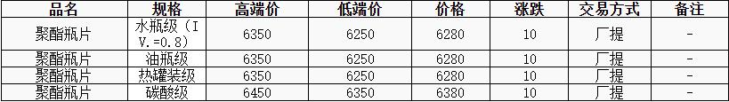 華東聚酯瓶片價格上漲10元至6280元/噸,系列政策提振市場情緒,原料窄幅上揚。然聚酯瓶片工廠價格補跌30-50元/噸,部分工廠維穩(wěn)。市場重心略有上揚,9-10月貨源報盤6280-6350元/噸或期貨合約03升水40-60元/噸;11-12月貨源報盤6250元/噸左右。