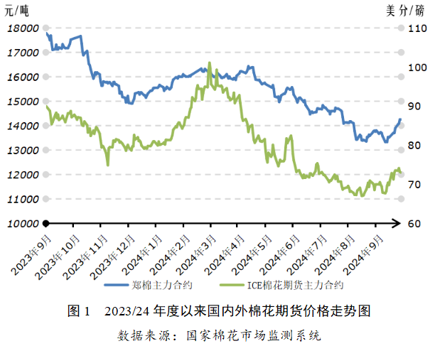 進(jìn)入9月,美國(guó)颶風(fēng)影響新棉吐絮采摘,美國(guó)農(nóng)業(yè)部繼續(xù)調(diào)減全球棉花產(chǎn)量,全球紡織進(jìn)入傳統(tǒng)產(chǎn)銷旺季,紡織市場(chǎng)產(chǎn)銷有所好轉(zhuǎn),疊加美聯(lián)儲(chǔ)宣布降息、中國(guó)經(jīng)濟(jì)利好政策密集發(fā)布,市場(chǎng)看漲情緒增強(qiáng),內(nèi)外棉價(jià)有所反彈。截至9月26日,ICE棉花期貨主力合約結(jié)算價(jià)73.02美分/磅,較月初上漲3.03美分/磅,漲幅4.3%;代表進(jìn)口棉中國(guó)主港到岸均價(jià)的國(guó)際棉花指數(shù)(M)81.84美分/磅,較月初上漲3.42美分/磅,折人民幣進(jìn)口成本14164元/噸(1%關(guān)稅,不含港雜費(fèi)),較月初上漲592元/噸,漲幅4.4%。鄭州商品交易所棉花期貨主力合約結(jié)算價(jià)14240元/噸,較月初上漲570元/噸,漲幅4.2%;代表內(nèi)地標(biāo)準(zhǔn)級(jí)皮棉市場(chǎng)價(jià)格的國(guó)家棉花價(jià)格B指數(shù)15202元/噸,較月初上漲268元/噸,漲幅1.8%。