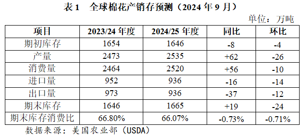 8月以來北半球主產(chǎn)國(guó)不利天氣增多,棉花產(chǎn)量和質(zhì)量預(yù)期受到影響。美國(guó)棉花產(chǎn)區(qū)干旱范圍占比一度達(dá)到43%,隨后颶風(fēng)“弗朗斯”給路易斯安那州產(chǎn)棉區(qū)帶來狂風(fēng)驟雨,不利于棉花吐絮;印度、巴基斯坦棉花產(chǎn)區(qū)也遭遇暴雨侵襲。據(jù)美國(guó)農(nóng)業(yè)部9月全球供需預(yù)測(cè),2024/25年度全球棉花產(chǎn)量2535萬噸,環(huán)比調(diào)減26萬噸。其中美國(guó)棉花產(chǎn)量316萬噸,環(huán)比調(diào)減13萬噸;印度棉花產(chǎn)量523萬噸,環(huán)比調(diào)減11萬噸;巴基斯坦棉花產(chǎn)量124萬噸,環(huán)比調(diào)減7萬噸。