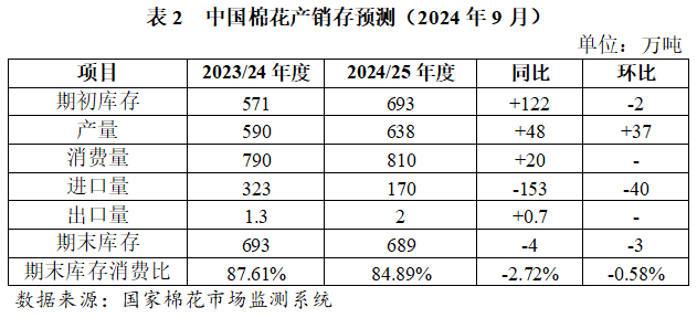 國(guó)內(nèi)新棉即將進(jìn)入大規(guī)模采摘階段,新疆棉花生長(zhǎng)好于去年,市場(chǎng)對(duì)新年度棉花增產(chǎn)預(yù)期較強(qiáng),據(jù)國(guó)家棉花市場(chǎng)監(jiān)測(cè)系統(tǒng)8月底棉花長(zhǎng)勢(shì)調(diào)查,2024/25年度新疆棉花產(chǎn)量預(yù)計(jì)為598萬噸,為歷史次高水平。但由于8月下旬及9月初以來降雨降溫天氣對(duì)棉籽發(fā)育和脫葉劑噴施效果產(chǎn)生不利影響,新疆棉花最終增產(chǎn)幅度可能低于預(yù)期。目前南疆手摘棉和內(nèi)地棉區(qū)開始采摘收購(gòu),籽棉收購(gòu)價(jià)6.9-7元/公斤左右,預(yù)計(jì)新疆機(jī)采棉10月初左右開始規(guī)模采摘。