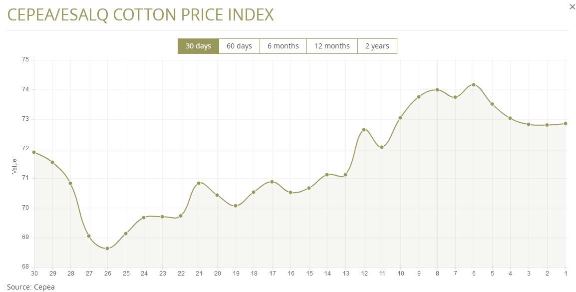 據(jù)外電10月4日消息,10月4日巴西CEPEA/ESALQ棉花價(jià)格指數(shù)報(bào)每磅72.85美分,較前一日上漲0.07%。