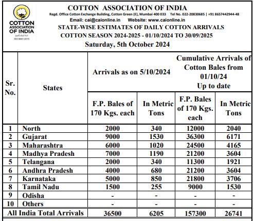 據(jù)外電10月5日消息,印度棉花協(xié)會(huì)(CAI)公布,10月5日印度棉花到貨量預(yù)估為36500包(每包170公斤)或6205噸。