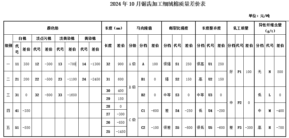 根據(jù)《中國棉花協(xié)會國產(chǎn)棉質(zhì)量差價表管理辦法》規(guī)定,現(xiàn)正式發(fā)布2024年10月《鋸齒加工細絨棉質(zhì)量差價表》、《皮輥加工細絨棉質(zhì)量差價表》、《長絨棉質(zhì)量差價表》(單位:元/噸)。