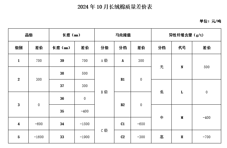 2024年度新花上市,為體現(xiàn)“優(yōu)質(zhì)優(yōu)價”的原則,保證棉花在采收、收購、軋花等環(huán)節(jié)的品質(zhì),引導市場各方注重棉花質(zhì)量提升,現(xiàn)對2024年10月《中國棉花協(xié)會國產(chǎn)棉質(zhì)量差價表》做如下調(diào)整: