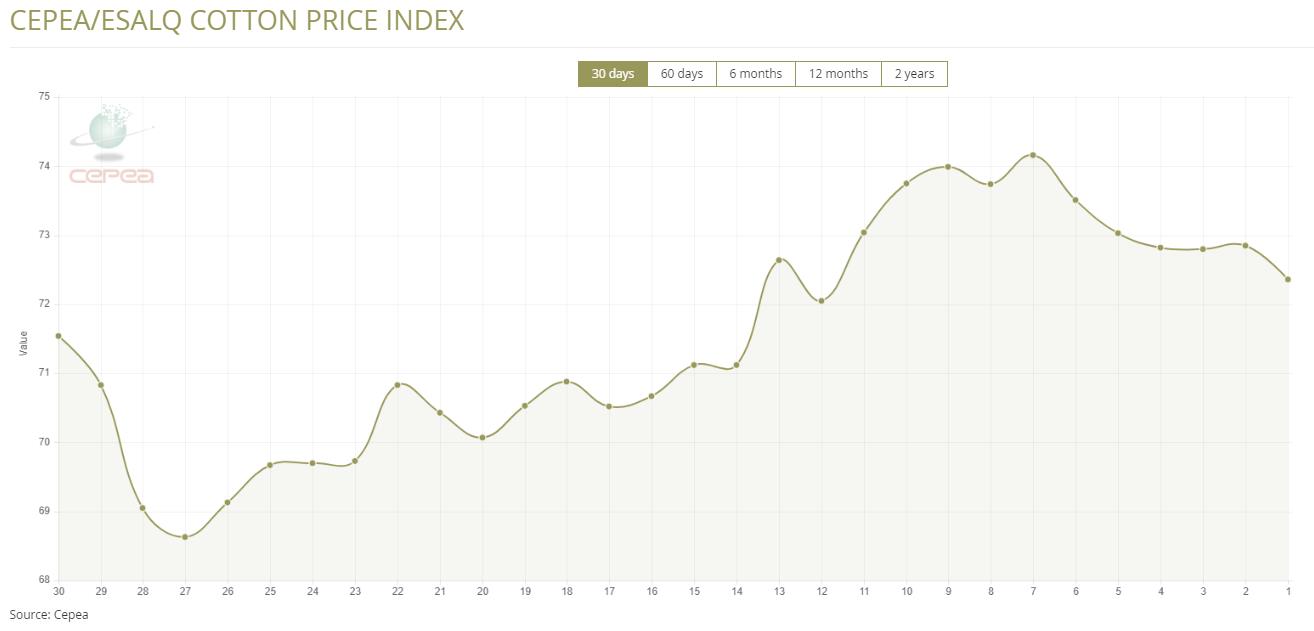 據外電10月7日消息,10月7日巴西CEPEA/ESALQ棉花價格指數報每磅72.36美分,較前一日下跌0.67%。