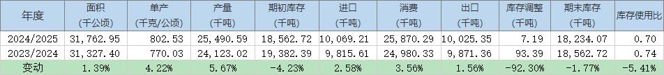 2024/25年度全球棉花期末庫存預估為1823.41萬噸(上月預估為1834.29萬噸),同比減少1.8%,2023/24年度期末庫存預估為1856.27萬噸。