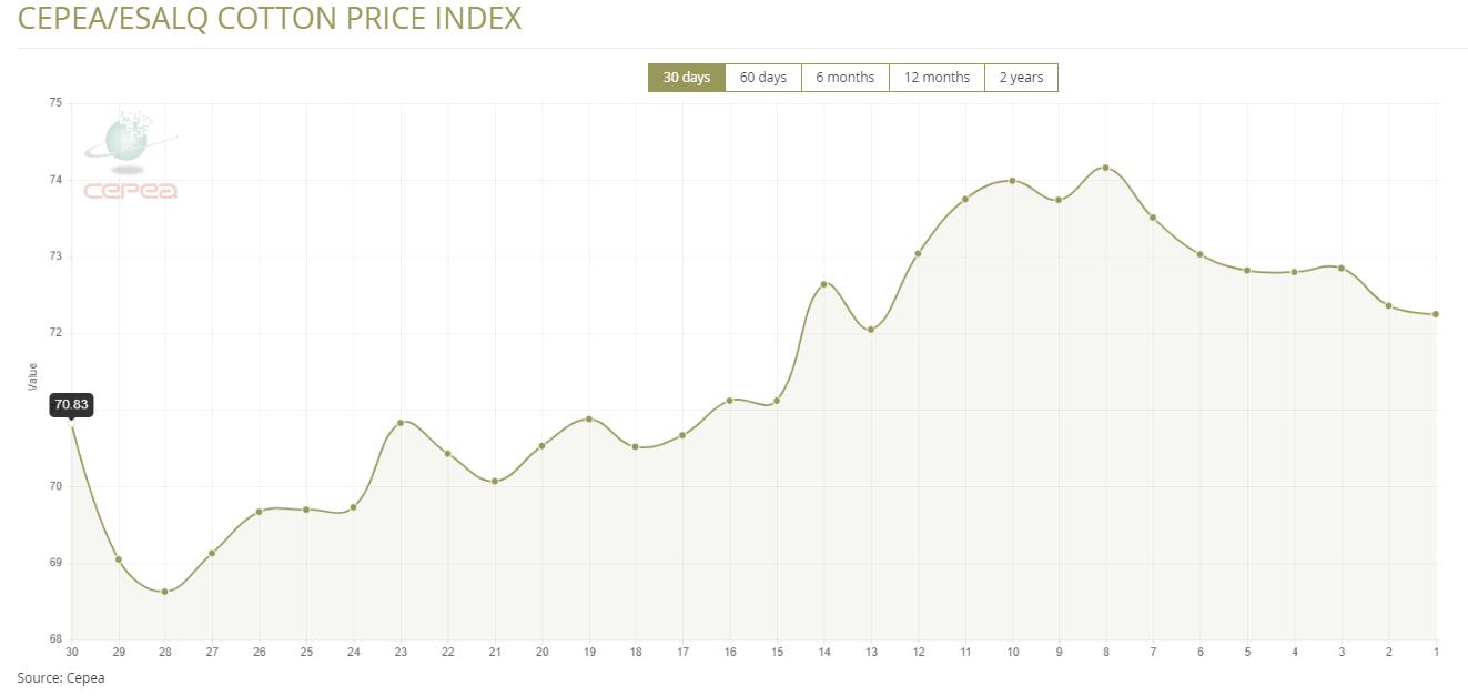據(jù)外電10月8日消息,10月8日巴西CEPEA/ESALQ棉花價(jià)格指數(shù)報(bào)每磅72.25美分,較前一日下跌0.15%。