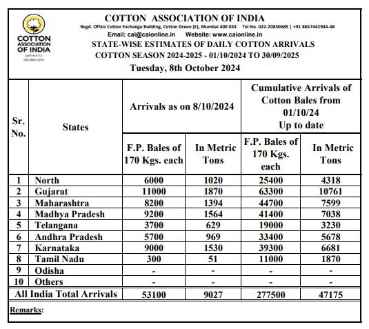 據(jù)外電10月8日消息,印度棉花協(xié)會(CAI)公布,10月8日印度棉花到貨量預(yù)估為53100包(每包170公斤)或9027噸。