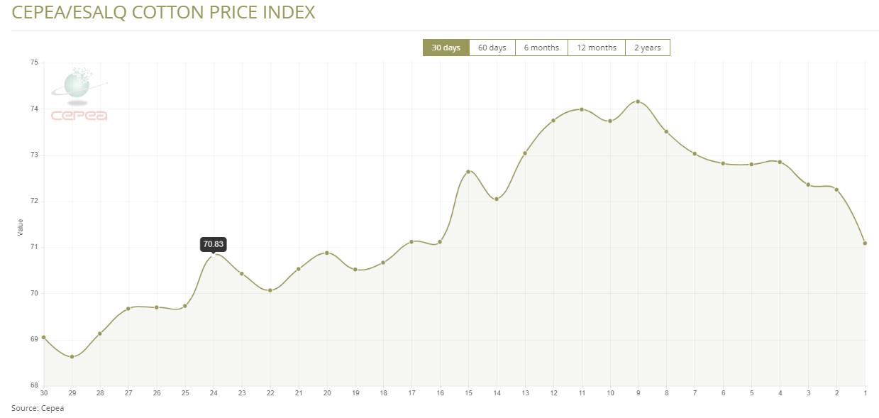 據(jù)外電10月9日消息,10月9日巴西CEPEA/ESALQ棉花價格指數(shù)報每磅71.09美分,較前一日下跌1.61%。