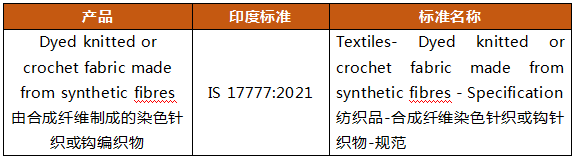 2024年10月7日,印度紡織部提交G/TBT/N/IND/346號通報,計劃對合成纖維制成的染色針織或鉤編織物(HS:6005.3790、6006.3200和HS:6002.4000、6002.9000、6003.3000、6004.1000、6004.9000)實施質(zhì)量控制。