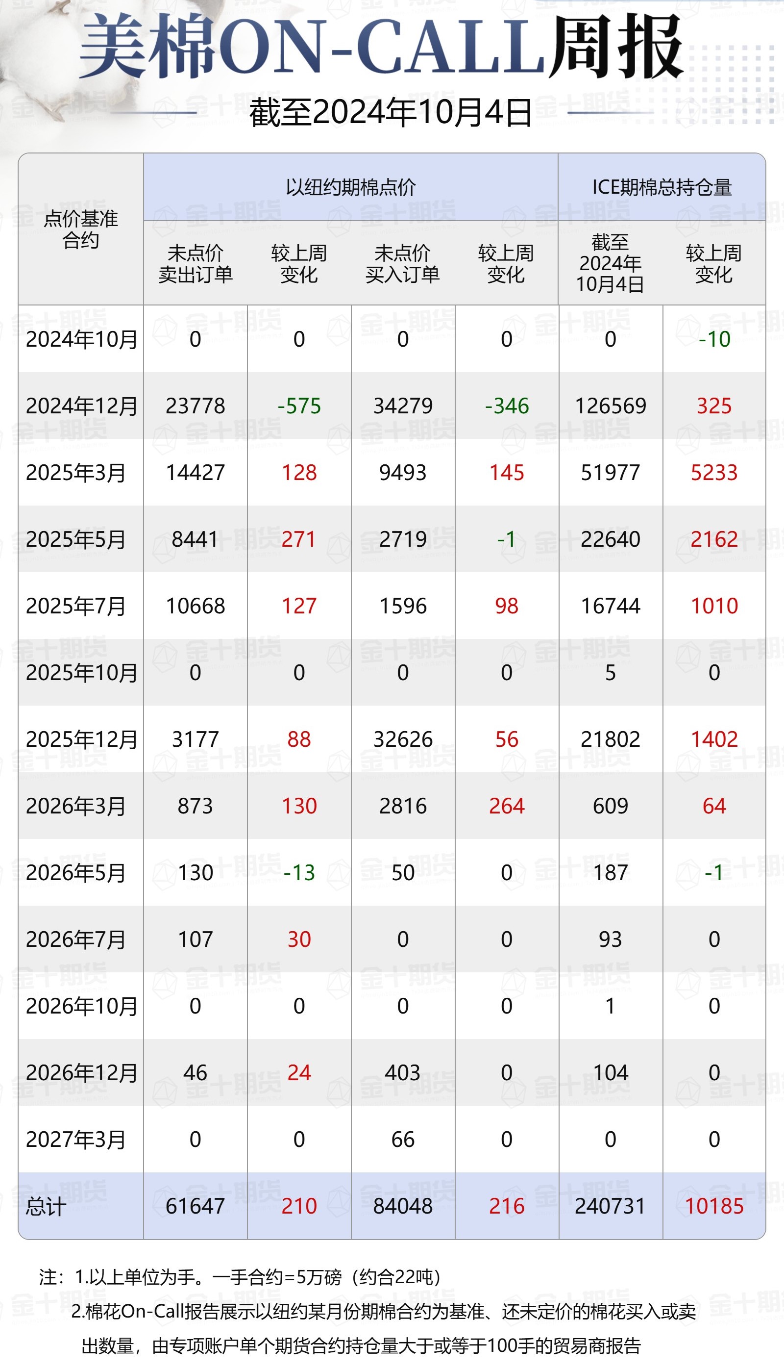 據(jù)美國商品期貨交易委員會(CFTC)最新數(shù)據(jù),截至10月4日,①美棉ON-call未點價賣出訂單61647手,環(huán)比增加210手;未點價買入訂單84048手,環(huán)比增加216手;②ICE期棉2410合約上賣方未點價合約為0手,環(huán)比增加0手;③ICE期棉2412合約上賣方未點價合約為23778手,環(huán)比減少575手;④ICE期棉2503合約上賣方未點價合約為14427手,環(huán)比增加128手;⑤ICE期棉2505合約上賣方未點價合約為8441手,環(huán)比增加271手;⑥ICE期棉2507合約上賣方未點價合約為10668手,環(huán)比增加127手;⑦ICE棉花期貨盤面2024/25年度(8月至次年7月)的ON-call合約未點價賣出訂單為57314手,環(huán)比減少49手。