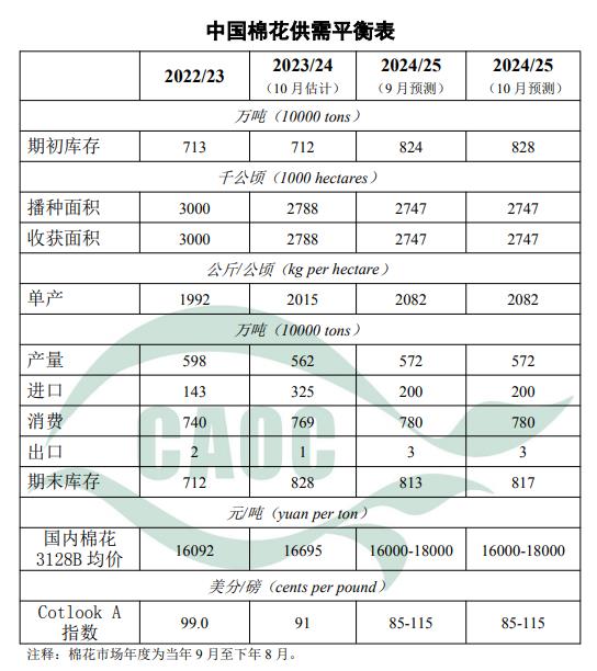 2023/24棉花市場年度結(jié)束。據(jù)海關(guān)統(tǒng)計,本年度中國實際進口量325萬噸,較估值調(diào)增5萬噸,期末庫存調(diào)增至828萬噸。本月預測,新年度棉花產(chǎn)量、消費量、進口量維持上月預測不變。全國棉花進入集中采收期,新疆整體采摘進度約20-30%。