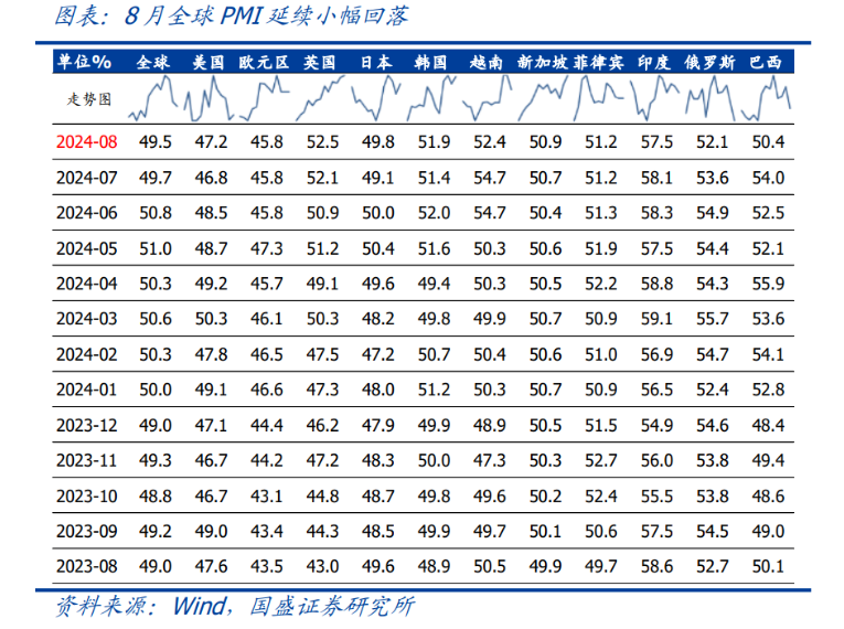 2024年8月中國(guó)綜合PMI產(chǎn)出指數(shù)為50.1%,較上月下降0.1個(gè)百分點(diǎn)。制造業(yè)PMI分項(xiàng)中,只有產(chǎn)成品庫(kù)存和新出口訂單指數(shù)上行,而原材料購(gòu)進(jìn)價(jià)格和出廠價(jià)格指數(shù)下行幅度最大,生產(chǎn)經(jīng)營(yíng)活動(dòng)預(yù)期和采購(gòu)量指數(shù)也呈顯著下降。這意味著當(dāng)前工業(yè)領(lǐng)域仍面臨需求不足、被動(dòng)補(bǔ)庫(kù)的局面,且企業(yè)預(yù)期有轉(zhuǎn)弱跡象。