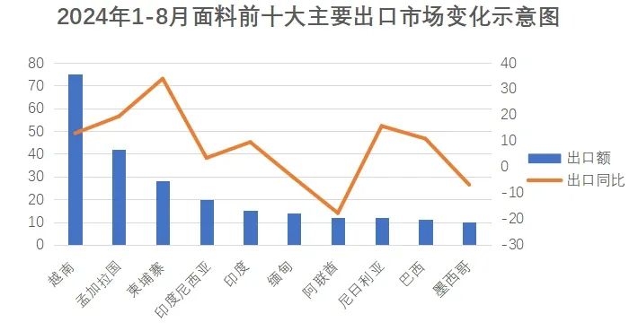亞洲是我國(guó)面料出口主要市場(chǎng),2024年1-8月我國(guó)對(duì)亞洲國(guó)家出口面料301.2億美元,占面料出口總額的67.4%。在前十大目標(biāo)市場(chǎng)出口中,亞洲市場(chǎng)占7席。越南作為我國(guó)面料出口最大的單一市場(chǎng),占我國(guó)面料對(duì)全球出口的16.8%,出口額74.9億美元,同比增長(zhǎng)12.9%。